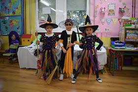 Decoramos nuestra mesa con las brujitas que trajo Leyre.